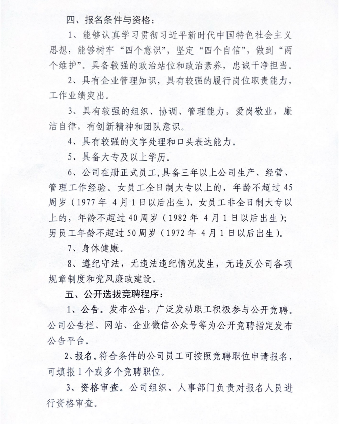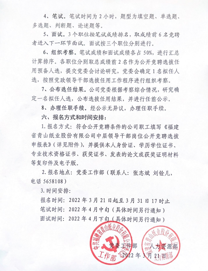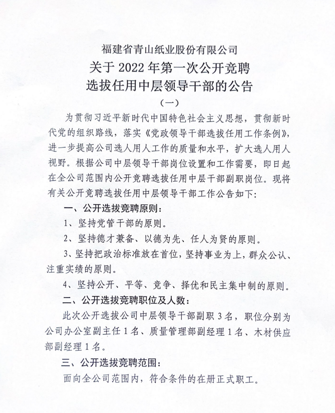 福建省金年會紙業(yè)股份有限公司 關(guān)于2022年第一次公競聘選拔任用中層領(lǐng)導(dǎo)干部的公告(一)
